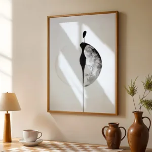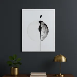 A poetic fusion of minimalism and fluid artistry, this abstract composition exudes a quiet elegance. A delicate black form extends gracefully within a soft, circular outline, evoking a sense of movement and stillness. The interplay of light and shadow, ink and air, creates a tranquil yet thought-provoking statement piece—perfect for modern, Japandi, and Scandinavian interiors.